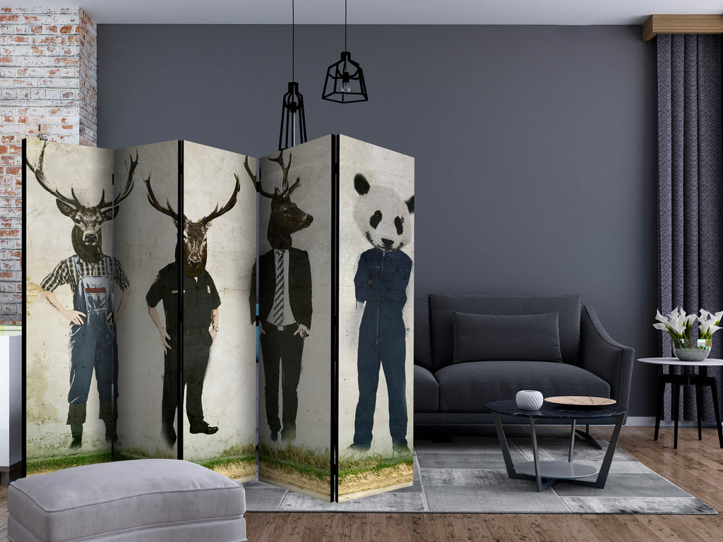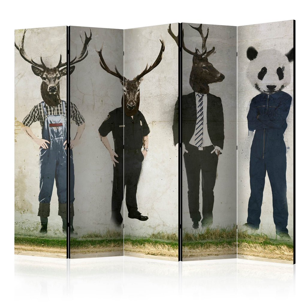 Het decoratieve vouwscherm "Vouwscherm - Man or Animal? II [Room Dividers]" past uitzonderlijk mooi in een modern interieur. Het houten tweezijdig bedrukte vouwscherm geeft niet alleen een mooie opdeling van een ruimte maar geeft ook een fantastische flair aan uw interieur. De perfectie uitvoering en het originele motief in full HD uitvoering zorgen ervoor dat de kamervouwschermen iedere ruimte een originele charme verschaffen. Een prachtig kamervouwscherm is een zeer originele versiering en kan bijvoorbeeld prima worden toegepast in woningen of dienstruimten. (kapsalon, dokterskliniek, administratiekantoor etc)