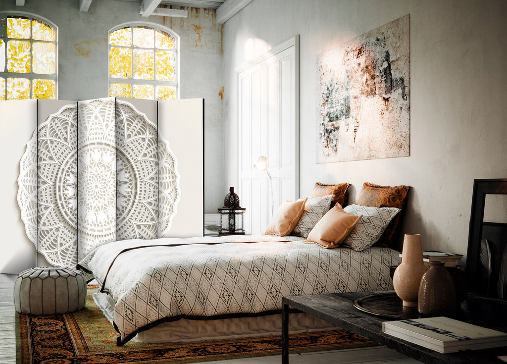 Het decoratieve vouwscherm "Vouwscherm - Mandala 3D II [Room Dividers]" past uitzonderlijk mooi in een modern interieur. Het houten tweezijdig bedrukte vouwscherm geeft niet alleen een mooie opdeling van een ruimte maar geeft ook een fantastische flair aan uw interieur. De perfectie uitvoering en het originele motief in full HD uitvoering zorgen ervoor dat de kamervouwschermen iedere ruimte een originele charme verschaffen. Een prachtig kamervouwscherm is een zeer originele versiering en kan bijvoorbeeld prima worden toegepast in woningen of dienstruimten. (kapsalon, dokterskliniek, administratiekantoor etc)