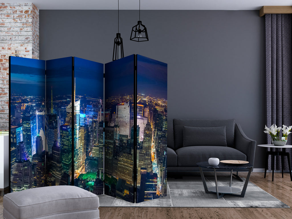 Het decoratieve vouwscherm "Vouwscherm - Manhattan - night II [Room Dividers]" past uitzonderlijk mooi in een modern interieur. Het houten tweezijdig bedrukte vouwscherm geeft niet alleen een mooie opdeling van een ruimte maar geeft ook een fantastische flair aan uw interieur. De perfectie uitvoering en het originele motief in full HD uitvoering zorgen ervoor dat de kamervouwschermen iedere ruimte een originele charme verschaffen. Een prachtig kamervouwscherm is een zeer originele versiering en kan bijvoorbeeld prima worden toegepast in woningen of dienstruimten. (kapsalon, dokterskliniek, administratiekantoor etc)