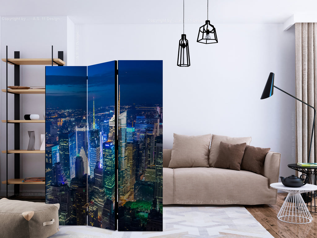 Het decoratieve vouwscherm "Vouwscherm - Manhattan - night [Room Dividers]" past uitzonderlijk mooi in een modern interieur. Het houten driedelige en tweezijdig bedrukte vouwscherm geeft niet alleen een mooie opdeling van een ruimte maar geeft ook een fantastische flair aan uw interieur. De perfectie uitvoering en het originele motief in full HD uitvoering zorgen ervoor dat de kamervouwschermen iedere ruimte een originele charme verschaffen. Een prachtig kamervouwscherm is een zeer originele versiering en kan bijvoorbeeld prima worden toegepast in woningen of dienstruimten. (kapsalon, dokterskliniek, administratiekantoor etc)