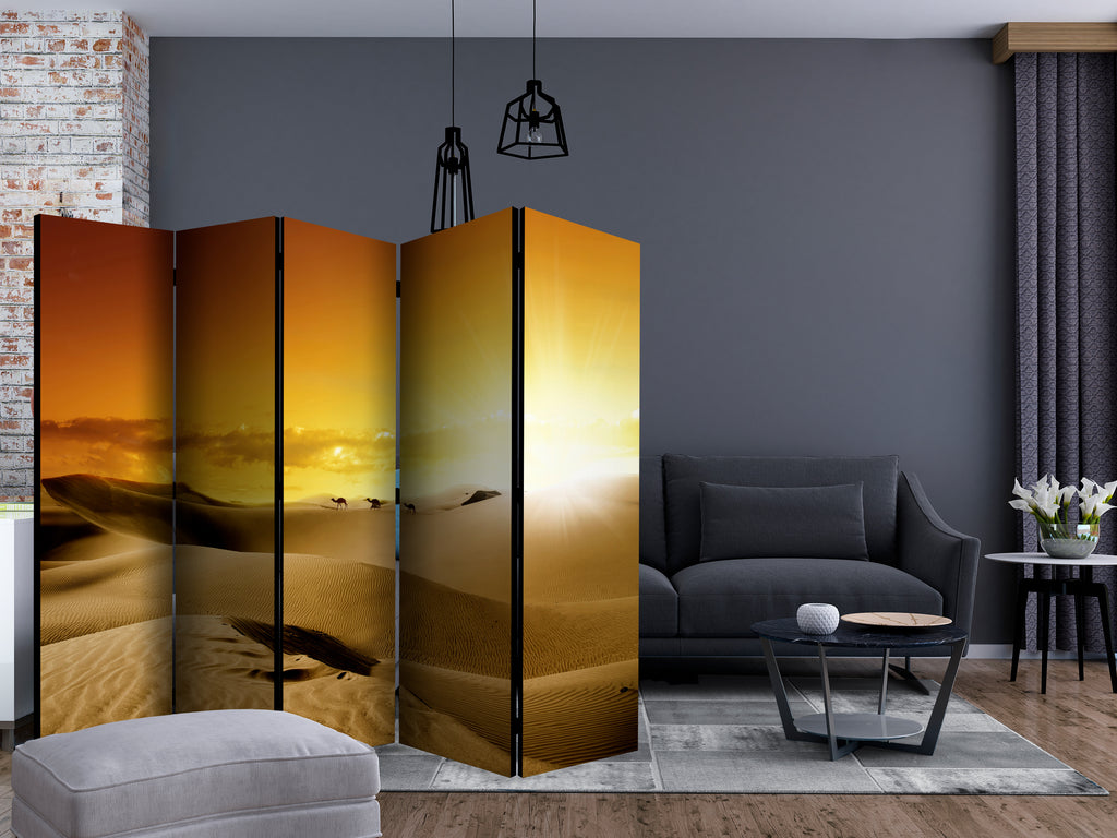Het decoratieve vouwscherm "Vouwscherm - March of camels II [Room Dividers]" past uitzonderlijk mooi in een modern interieur. Het houten tweezijdig bedrukte vouwscherm geeft niet alleen een mooie opdeling van een ruimte maar geeft ook een fantastische flair aan uw interieur. De perfectie uitvoering en het originele motief in full HD uitvoering zorgen ervoor dat de kamervouwschermen iedere ruimte een originele charme verschaffen. Een prachtig kamervouwscherm is een zeer originele versiering en kan bijvoorbeeld prima worden toegepast in woningen of dienstruimten. (kapsalon, dokterskliniek, administratiekantoor etc)