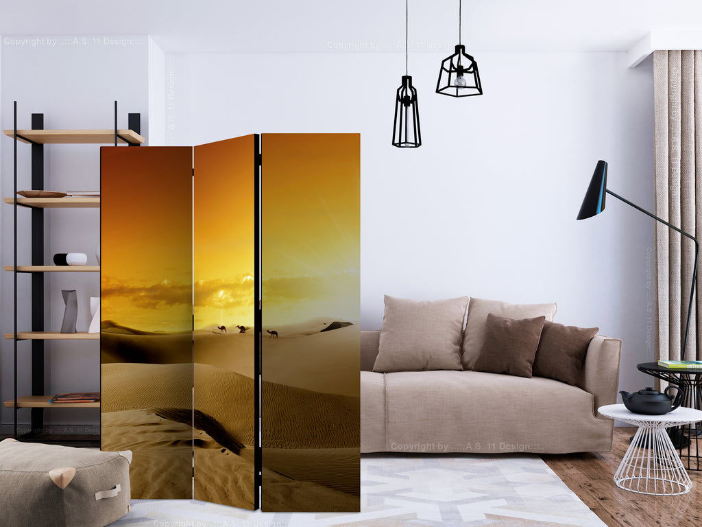Het decoratieve vouwscherm "Vouwscherm - March of camels [Room Dividers]" past uitzonderlijk mooi in een modern interieur. Het houten driedelige en tweezijdig bedrukte vouwscherm geeft niet alleen een mooie opdeling van een ruimte maar geeft ook een fantastische flair aan uw interieur. De perfectie uitvoering en het originele motief in full HD uitvoering zorgen ervoor dat de kamervouwschermen iedere ruimte een originele charme verschaffen. Een prachtig kamervouwscherm is een zeer originele versiering en kan bijvoorbeeld prima worden toegepast in woningen of dienstruimten. (kapsalon, dokterskliniek, administratiekantoor etc)