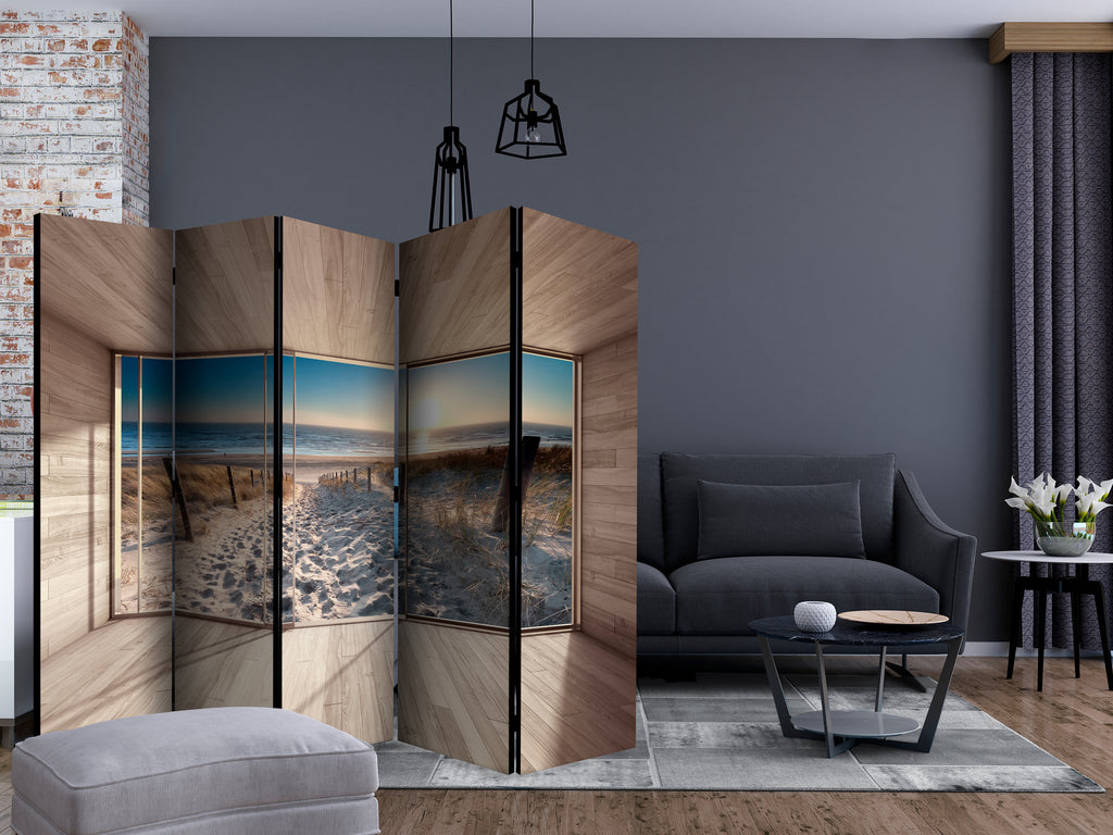 Het decoratieve vouwscherm "Vouwscherm - Modern Lounge: By the Sea II [Room Dividers]" past uitzonderlijk mooi in een modern interieur. Het houten tweezijdig bedrukte vouwscherm geeft niet alleen een mooie opdeling van een ruimte maar geeft ook een fantastische flair aan uw interieur. De perfectie uitvoering en het originele motief in full HD uitvoering zorgen ervoor dat de kamervouwschermen iedere ruimte een originele charme verschaffen. Een prachtig kamervouwscherm is een zeer originele versiering en kan bijvoorbeeld prima worden toegepast in woningen of dienstruimten. (kapsalon, dokterskliniek, administratiekantoor etc)