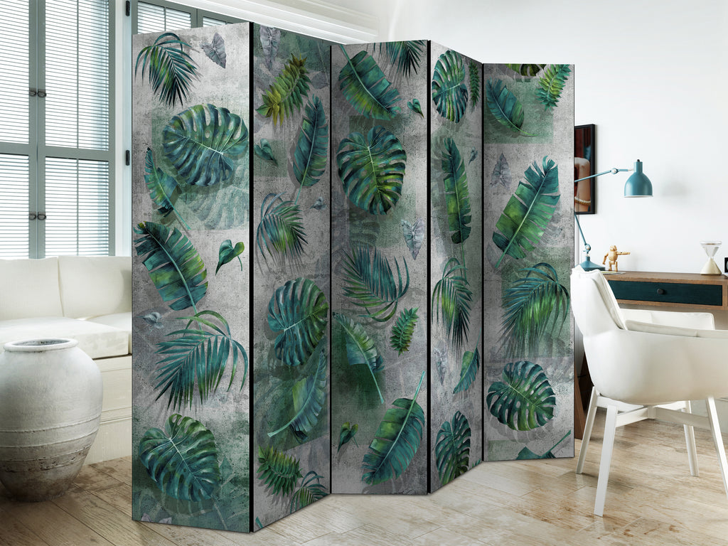 Het decoratieve vouwscherm "Vouwscherm - Modernist Jungle II [Room Dividers]" past uitzonderlijk mooi in een modern interieur. Het houten tweezijdig bedrukte vouwscherm geeft niet alleen een mooie opdeling van een ruimte maar geeft ook een fantastische flair aan uw interieur. De perfectie uitvoering en het originele motief in full HD uitvoering zorgen ervoor dat de kamervouwschermen iedere ruimte een originele charme verschaffen. Een prachtig kamervouwscherm is een zeer originele versiering en kan bijvoorbeeld prima worden toegepast in woningen of dienstruimten. (kapsalon, dokterskliniek, administratiekantoor etc)