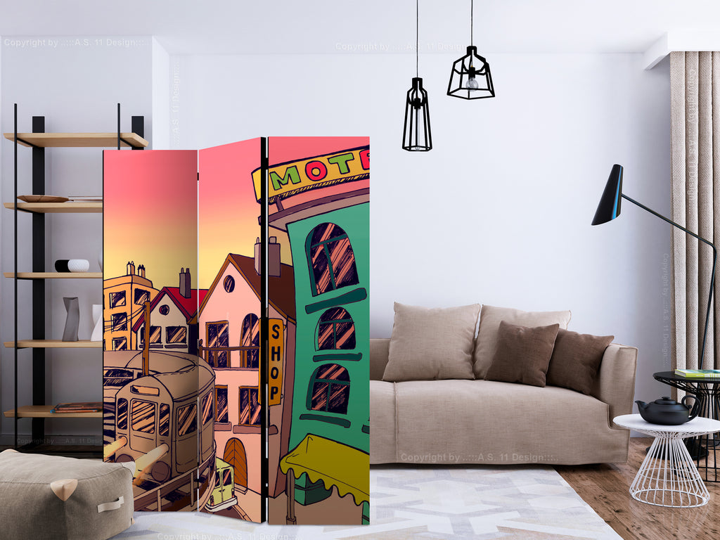 Het decoratieve vouwscherm "Vouwscherm - Morning in a city [Room Dividers]" past uitzonderlijk mooi in een modern interieur. Het houten driedelige en tweezijdig bedrukte vouwscherm geeft niet alleen een mooie opdeling van een ruimte maar geeft ook een fantastische flair aan uw interieur. De perfectie uitvoering en het originele motief in full HD uitvoering zorgen ervoor dat de kamervouwschermen iedere ruimte een originele charme verschaffen. Een prachtig kamervouwscherm is een zeer originele versiering en kan bijvoorbeeld prima worden toegepast in woningen of dienstruimten. (kapsalon, dokterskliniek, administratiekantoor etc)