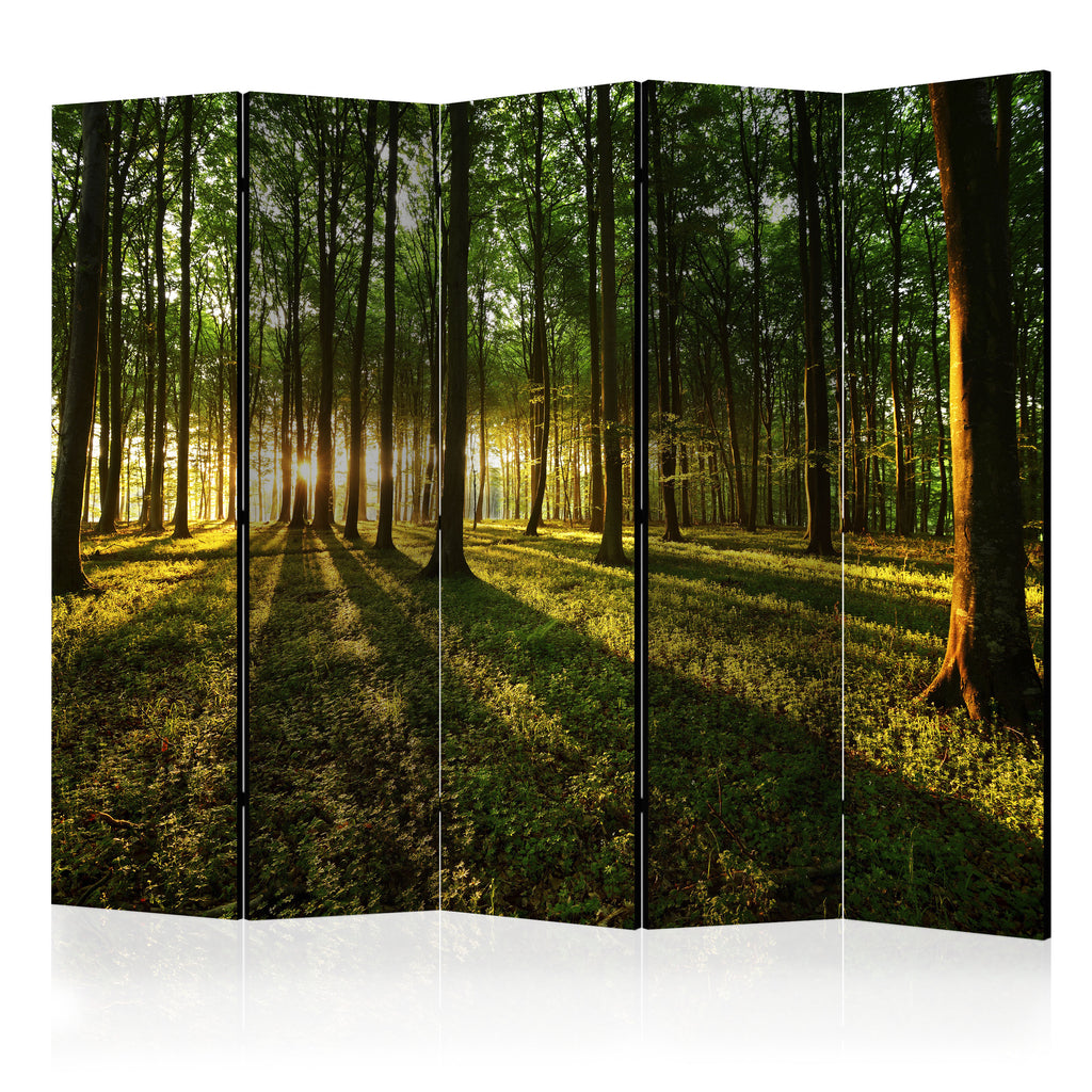 Het decoratieve vouwscherm "Vouwscherm - Morning in the Forest II [Room Dividers]" past uitzonderlijk mooi in een modern interieur. Het houten tweezijdig bedrukte vouwscherm geeft niet alleen een mooie opdeling van een ruimte maar geeft ook een fantastische flair aan uw interieur. De perfectie uitvoering en het originele motief in full HD uitvoering zorgen ervoor dat de kamervouwschermen iedere ruimte een originele charme verschaffen. Een prachtig kamervouwscherm is een zeer originele versiering en kan bijvoorbeeld prima worden toegepast in woningen of dienstruimten. (kapsalon, dokterskliniek, administratiekantoor etc)