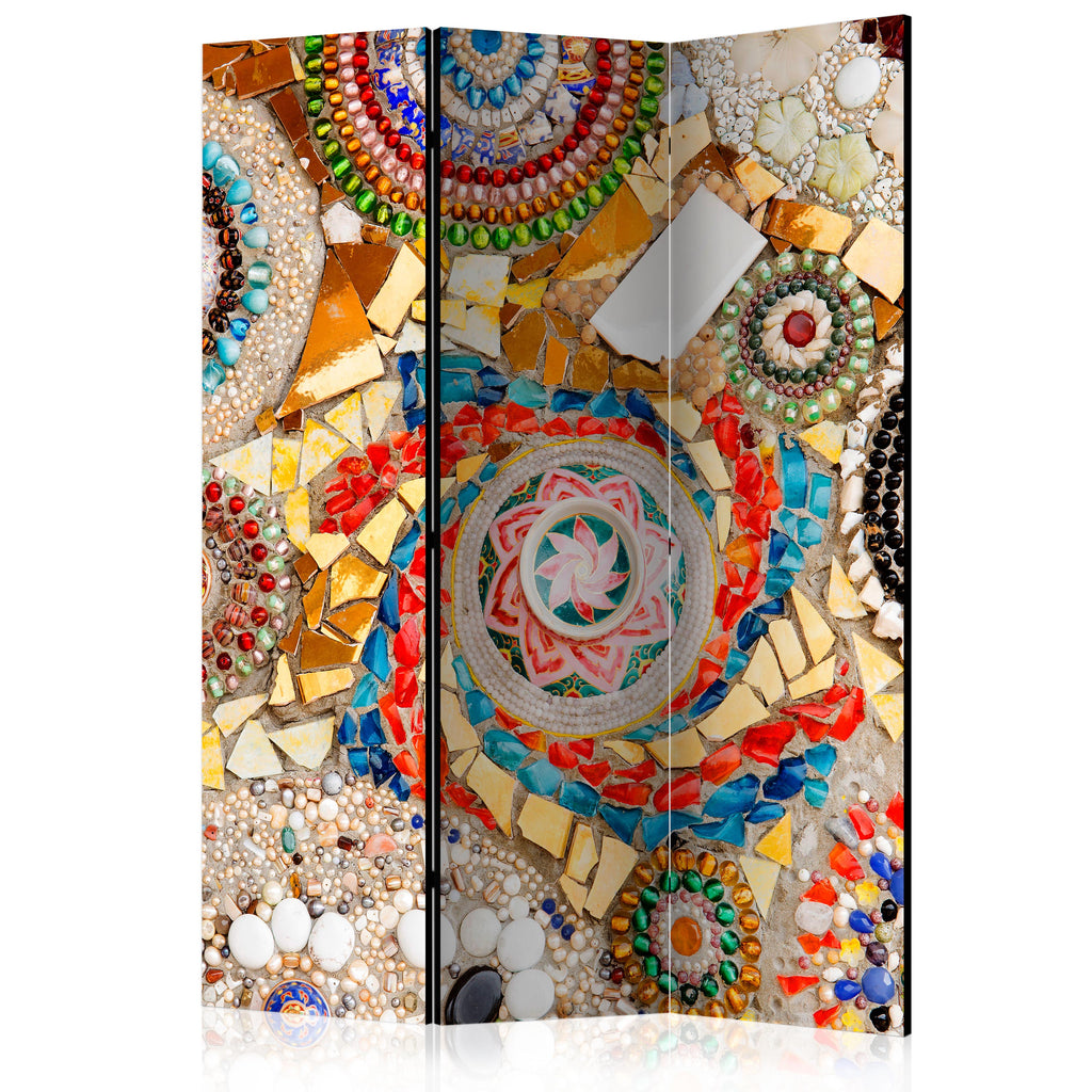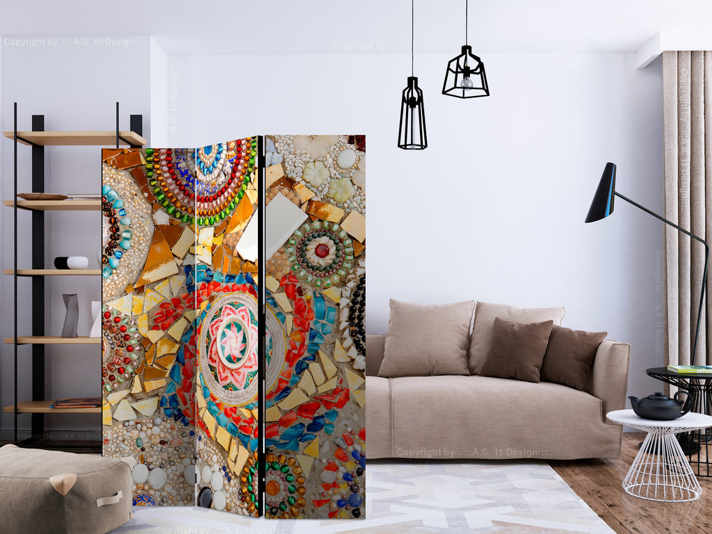 Het decoratieve vouwscherm "Vouwscherm - Moroccan Mosaic [Room Dividers]" past uitzonderlijk mooi in een modern interieur. Het houten driedelige en tweezijdig bedrukte vouwscherm geeft niet alleen een mooie opdeling van een ruimte maar geeft ook een fantastische flair aan uw interieur. De perfectie uitvoering en het originele motief in full HD uitvoering zorgen ervoor dat de kamervouwschermen iedere ruimte een originele charme verschaffen. Een prachtig kamervouwscherm is een zeer originele versiering en kan bijvoorbeeld prima worden toegepast in woningen of dienstruimten. (kapsalon, dokterskliniek, administratiekantoor etc)