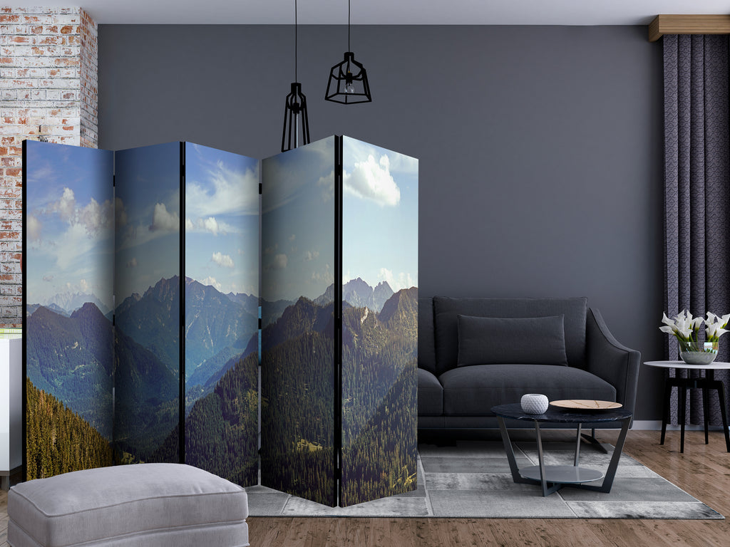 Het decoratieve vouwscherm "Vouwscherm - Mountains Magic II [Room Dividers]" past uitzonderlijk mooi in een modern interieur. Het houten tweezijdig bedrukte vouwscherm geeft niet alleen een mooie opdeling van een ruimte maar geeft ook een fantastische flair aan uw interieur. De perfectie uitvoering en het originele motief in full HD uitvoering zorgen ervoor dat de kamervouwschermen iedere ruimte een originele charme verschaffen. Een prachtig kamervouwscherm is een zeer originele versiering en kan bijvoorbeeld prima worden toegepast in woningen of dienstruimten. (kapsalon, dokterskliniek, administratiekantoor etc)