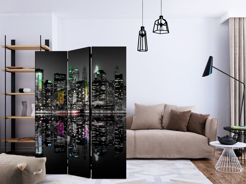 Het decoratieve vouwscherm "Vouwscherm - New York - My Dream [Room Dividers]" past uitzonderlijk mooi in een modern interieur. Het houten driedelige en tweezijdig bedrukte vouwscherm geeft niet alleen een mooie opdeling van een ruimte maar geeft ook een fantastische flair aan uw interieur. De perfectie uitvoering en het originele motief in full HD uitvoering zorgen ervoor dat de kamervouwschermen iedere ruimte een originele charme verschaffen. Een prachtig kamervouwscherm is een zeer originele versiering en kan bijvoorbeeld prima worden toegepast in woningen of dienstruimten. (kapsalon, dokterskliniek, administratiekantoor etc)