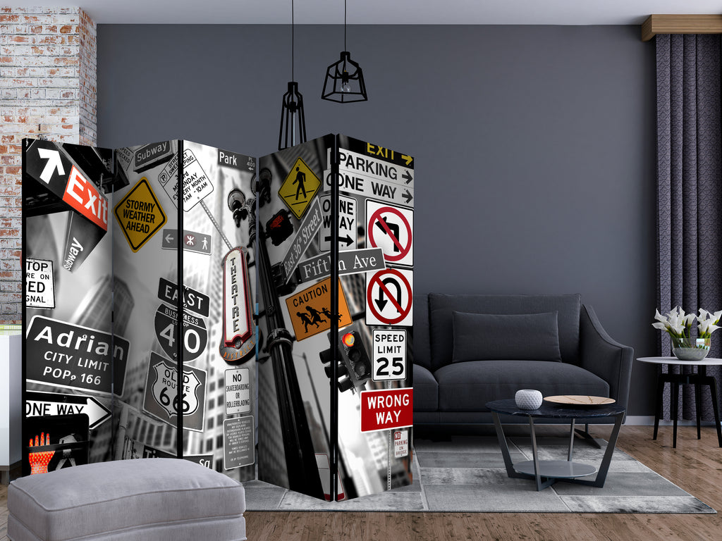Het decoratieve vouwscherm "Vouwscherm - New York Signs II [Room Dividers]" past uitzonderlijk mooi in een modern interieur. Het houten tweezijdig bedrukte vouwscherm geeft niet alleen een mooie opdeling van een ruimte maar geeft ook een fantastische flair aan uw interieur. De perfectie uitvoering en het originele motief in full HD uitvoering zorgen ervoor dat de kamervouwschermen iedere ruimte een originele charme verschaffen. Een prachtig kamervouwscherm is een zeer originele versiering en kan bijvoorbeeld prima worden toegepast in woningen of dienstruimten. (kapsalon, dokterskliniek, administratiekantoor etc)