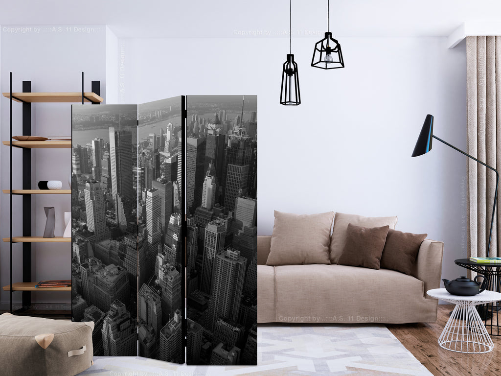 Het decoratieve vouwscherm "Vouwscherm - New York: skyscrapers (bird's eye view) [Room Dividers]" past uitzonderlijk mooi in een modern interieur. Het houten driedelige en tweezijdig bedrukte vouwscherm geeft niet alleen een mooie opdeling van een ruimte maar geeft ook een fantastische flair aan uw interieur. De perfectie uitvoering en het originele motief in full HD uitvoering zorgen ervoor dat de kamervouwschermen iedere ruimte een originele charme verschaffen. Een prachtig kamervouwscherm is een zeer originele versiering en kan bijvoorbeeld prima worden toegepast in woningen of dienstruimten. (kapsalon, dokterskliniek, administratiekantoor etc)