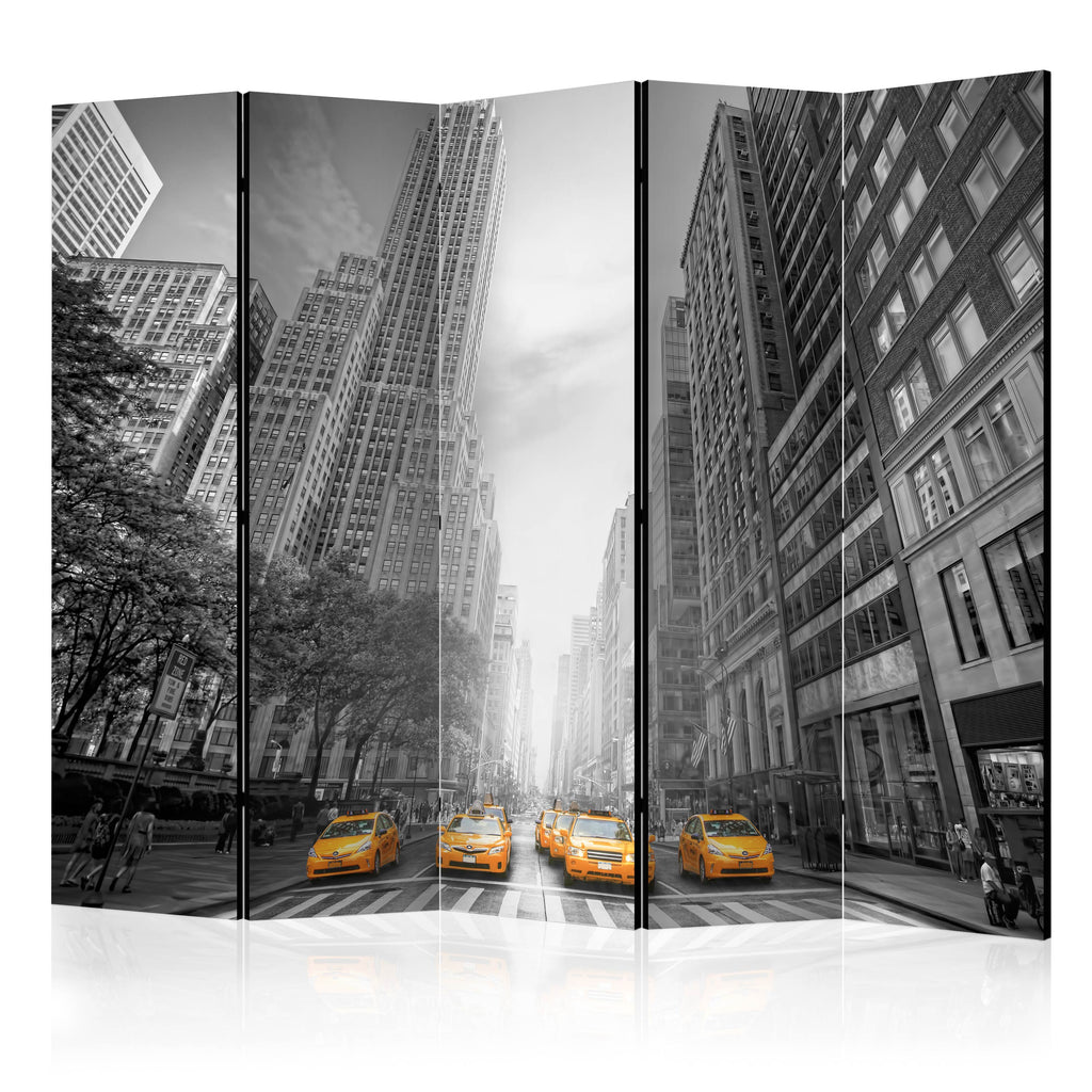 Het decoratieve vouwscherm "Vouwscherm - New York - yellow taxis II [Room Dividers]" past uitzonderlijk mooi in een modern interieur. Het houten tweezijdig bedrukte vouwscherm geeft niet alleen een mooie opdeling van een ruimte maar geeft ook een fantastische flair aan uw interieur. De perfectie uitvoering en het originele motief in full HD uitvoering zorgen ervoor dat de kamervouwschermen iedere ruimte een originele charme verschaffen. Een prachtig kamervouwscherm is een zeer originele versiering en kan bijvoorbeeld prima worden toegepast in woningen of dienstruimten. (kapsalon, dokterskliniek, administratiekantoor etc)