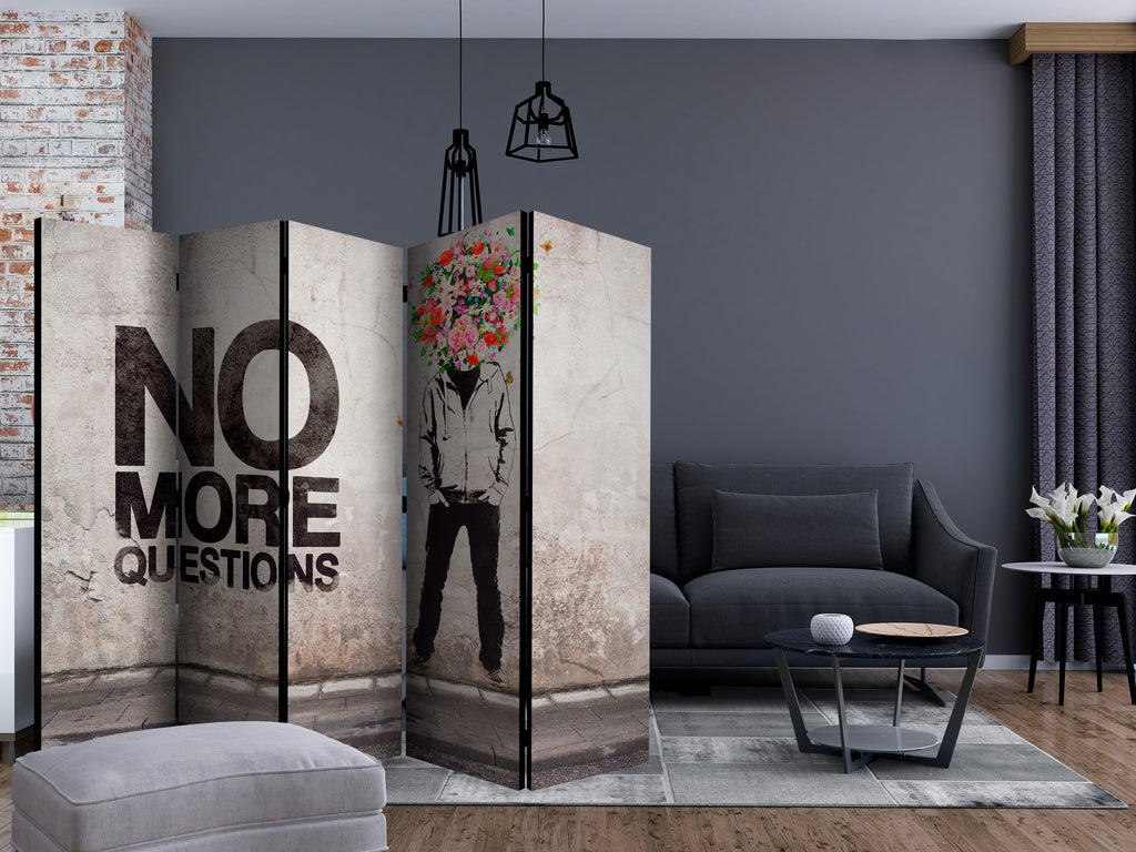 Het decoratieve vouwscherm "Vouwscherm - No more questions II [Room Dividers]" past uitzonderlijk mooi in een modern interieur. Het houten tweezijdig bedrukte vouwscherm geeft niet alleen een mooie opdeling van een ruimte maar geeft ook een fantastische flair aan uw interieur. De perfectie uitvoering en het originele motief in full HD uitvoering zorgen ervoor dat de kamervouwschermen iedere ruimte een originele charme verschaffen. Een prachtig kamervouwscherm is een zeer originele versiering en kan bijvoorbeeld prima worden toegepast in woningen of dienstruimten. (kapsalon, dokterskliniek, administratiekantoor etc)