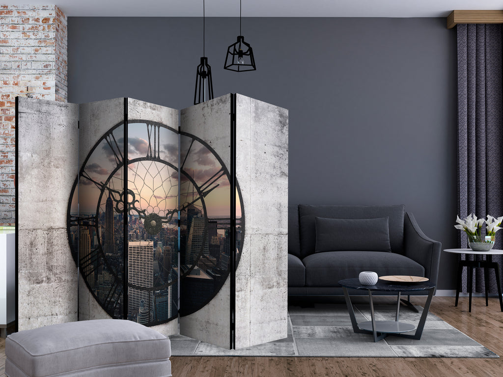 Het decoratieve vouwscherm "Vouwscherm - NYC Time Zone II [Room Dividers]" past uitzonderlijk mooi in een modern interieur. Het houten tweezijdig bedrukte vouwscherm geeft niet alleen een mooie opdeling van een ruimte maar geeft ook een fantastische flair aan uw interieur. De perfectie uitvoering en het originele motief in full HD uitvoering zorgen ervoor dat de kamervouwschermen iedere ruimte een originele charme verschaffen. Een prachtig kamervouwscherm is een zeer originele versiering en kan bijvoorbeeld prima worden toegepast in woningen of dienstruimten. (kapsalon, dokterskliniek, administratiekantoor etc)