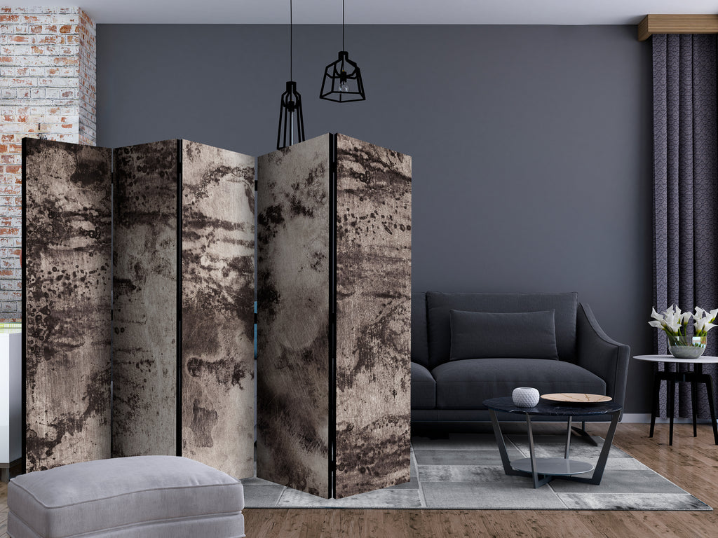 Het decoratieve vouwscherm "Vouwscherm - Old Metal II [Room Dividers]" past uitzonderlijk mooi in een modern interieur. Het houten tweezijdig bedrukte vouwscherm geeft niet alleen een mooie opdeling van een ruimte maar geeft ook een fantastische flair aan uw interieur. De perfectie uitvoering en het originele motief in full HD uitvoering zorgen ervoor dat de kamervouwschermen iedere ruimte een originele charme verschaffen. Een prachtig kamervouwscherm is een zeer originele versiering en kan bijvoorbeeld prima worden toegepast in woningen of dienstruimten. (kapsalon, dokterskliniek, administratiekantoor etc)