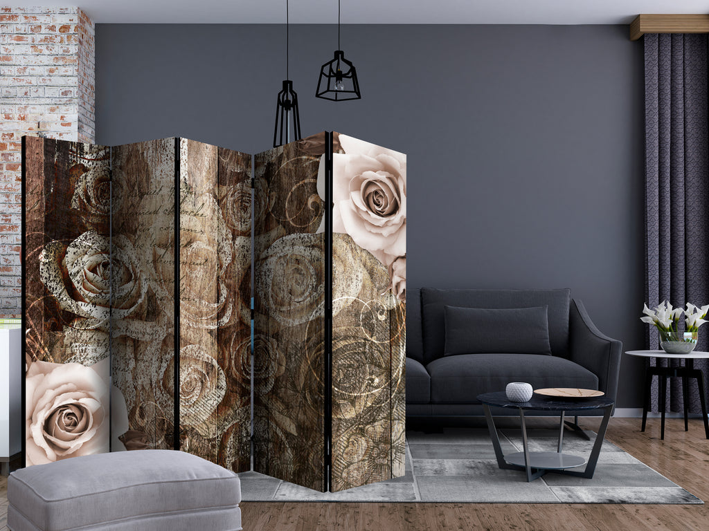 Het decoratieve vouwscherm "Vouwscherm - Old Wood & Roses II [Room Dividers]" past uitzonderlijk mooi in een modern interieur. Het houten tweezijdig bedrukte vouwscherm geeft niet alleen een mooie opdeling van een ruimte maar geeft ook een fantastische flair aan uw interieur. De perfectie uitvoering en het originele motief in full HD uitvoering zorgen ervoor dat de kamervouwschermen iedere ruimte een originele charme verschaffen. Een prachtig kamervouwscherm is een zeer originele versiering en kan bijvoorbeeld prima worden toegepast in woningen of dienstruimten. (kapsalon, dokterskliniek, administratiekantoor etc)