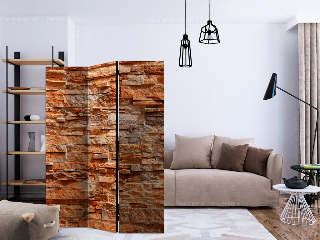 Het decoratieve vouwscherm "Vouwscherm - Orange Stone [Room Dividers]" past uitzonderlijk mooi in een modern interieur. Het houten driedelige en tweezijdig bedrukte vouwscherm geeft niet alleen een mooie opdeling van een ruimte maar geeft ook een fantastische flair aan uw interieur. De perfectie uitvoering en het originele motief in full HD uitvoering zorgen ervoor dat de kamervouwschermen iedere ruimte een originele charme verschaffen. Een prachtig kamervouwscherm is een zeer originele versiering en kan bijvoorbeeld prima worden toegepast in woningen of dienstruimten. (kapsalon, dokterskliniek, administratiekantoor etc)