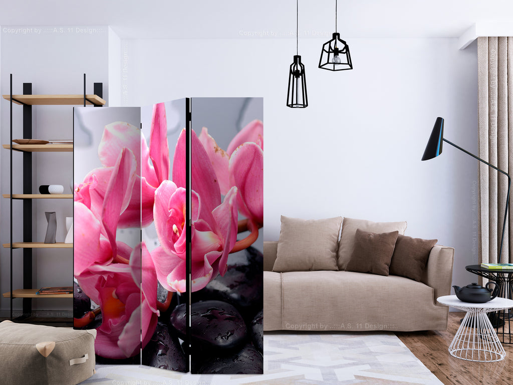Het decoratieve vouwscherm "Vouwscherm - Orchid flowers with zen stones [Room Dividers]" past uitzonderlijk mooi in een modern interieur. Het houten driedelige en tweezijdig bedrukte vouwscherm geeft niet alleen een mooie opdeling van een ruimte maar geeft ook een fantastische flair aan uw interieur. De perfectie uitvoering en het originele motief in full HD uitvoering zorgen ervoor dat de kamervouwschermen iedere ruimte een originele charme verschaffen. Een prachtig kamervouwscherm is een zeer originele versiering en kan bijvoorbeeld prima worden toegepast in woningen of dienstruimten. (kapsalon, dokterskliniek, administratiekantoor etc)