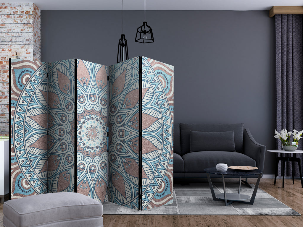 Het decoratieve vouwscherm "Vouwscherm - Oriental Circle II [Room Dividers]" past uitzonderlijk mooi in een modern interieur. Het houten tweezijdig bedrukte vouwscherm geeft niet alleen een mooie opdeling van een ruimte maar geeft ook een fantastische flair aan uw interieur. De perfectie uitvoering en het originele motief in full HD uitvoering zorgen ervoor dat de kamervouwschermen iedere ruimte een originele charme verschaffen. Een prachtig kamervouwscherm is een zeer originele versiering en kan bijvoorbeeld prima worden toegepast in woningen of dienstruimten. (kapsalon, dokterskliniek, administratiekantoor etc)