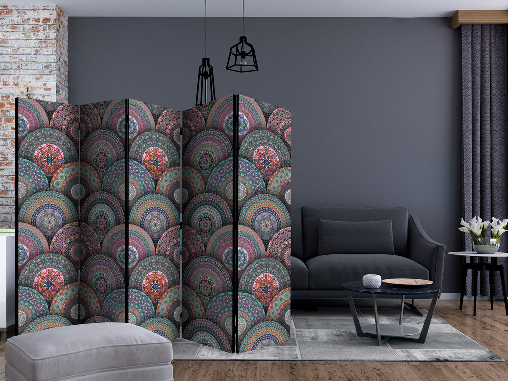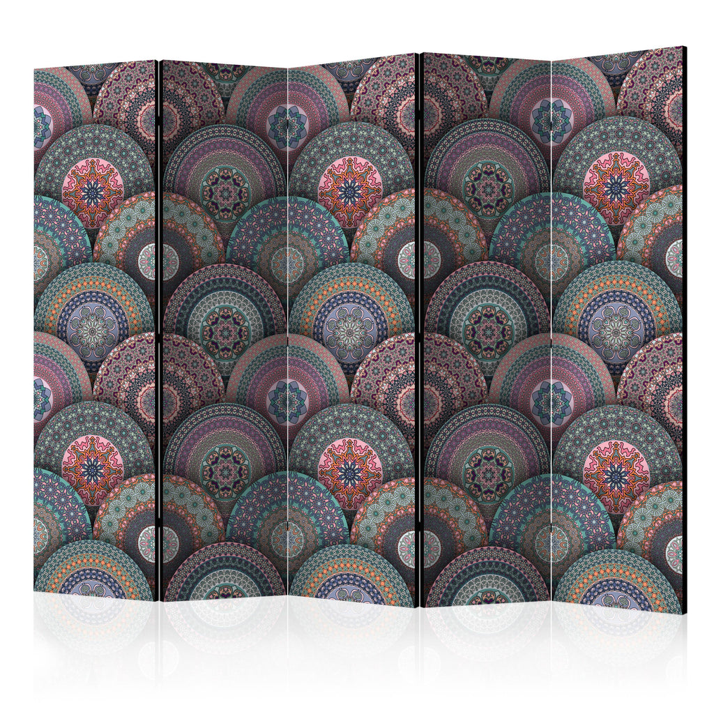 Het decoratieve vouwscherm "Vouwscherm - Oriental Kaleidoscope II [Room Dividers]" past uitzonderlijk mooi in een modern interieur. Het houten tweezijdig bedrukte vouwscherm geeft niet alleen een mooie opdeling van een ruimte maar geeft ook een fantastische flair aan uw interieur. De perfectie uitvoering en het originele motief in full HD uitvoering zorgen ervoor dat de kamervouwschermen iedere ruimte een originele charme verschaffen. Een prachtig kamervouwscherm is een zeer originele versiering en kan bijvoorbeeld prima worden toegepast in woningen of dienstruimten. (kapsalon, dokterskliniek, administratiekantoor etc)