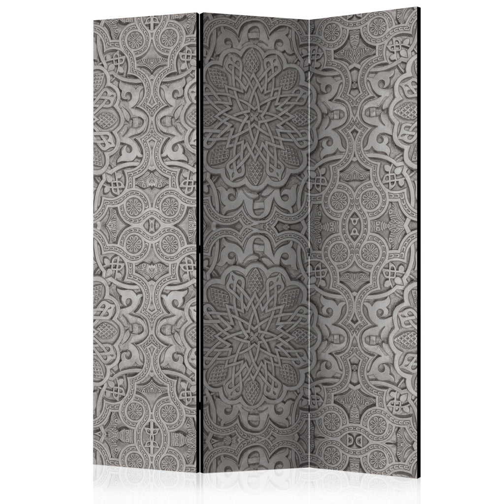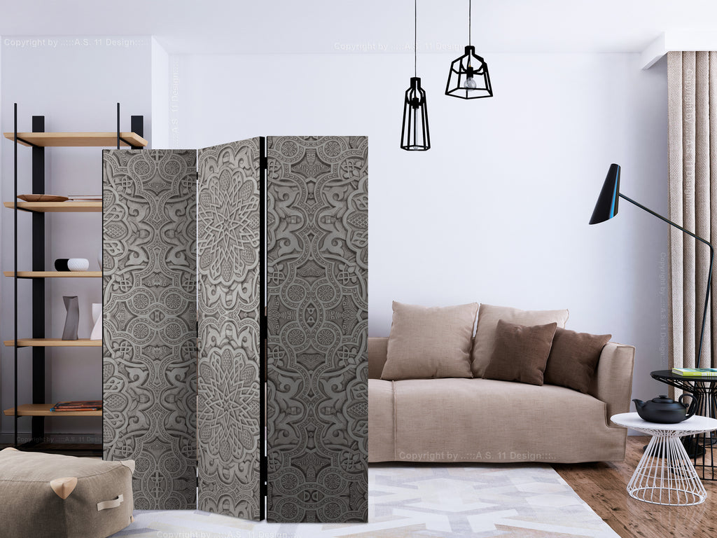 Het decoratieve vouwscherm "Vouwscherm - Oriental ornament [Room Dividers]" past uitzonderlijk mooi in een modern interieur. Het houten driedelige en tweezijdig bedrukte vouwscherm geeft niet alleen een mooie opdeling van een ruimte maar geeft ook een fantastische flair aan uw interieur. De perfectie uitvoering en het originele motief in full HD uitvoering zorgen ervoor dat de kamervouwschermen iedere ruimte een originele charme verschaffen. Een prachtig kamervouwscherm is een zeer originele versiering en kan bijvoorbeeld prima worden toegepast in woningen of dienstruimten. (kapsalon, dokterskliniek, administratiekantoor etc)
