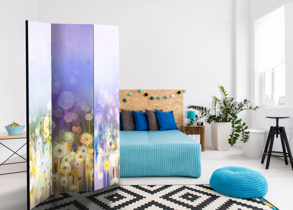 Het decoratieve vouwscherm "Vouwscherm - Painted Meadow [Room Dividers]" past uitzonderlijk mooi in een modern interieur. Het houten driedelige en tweezijdig bedrukte vouwscherm geeft niet alleen een mooie opdeling van een ruimte maar geeft ook een fantastische flair aan uw interieur. De perfectie uitvoering en het originele motief in full HD uitvoering zorgen ervoor dat de kamervouwschermen iedere ruimte een originele charme verschaffen. Een prachtig kamervouwscherm is een zeer originele versiering en kan bijvoorbeeld prima worden toegepast in woningen of dienstruimten. (kapsalon, dokterskliniek, administratiekantoor etc)