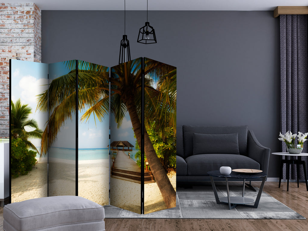 Het decoratieve vouwscherm "Vouwscherm - Paradise beach II [Room Dividers]" past uitzonderlijk mooi in een modern interieur. Het houten tweezijdig bedrukte vouwscherm geeft niet alleen een mooie opdeling van een ruimte maar geeft ook een fantastische flair aan uw interieur. De perfectie uitvoering en het originele motief in full HD uitvoering zorgen ervoor dat de kamervouwschermen iedere ruimte een originele charme verschaffen. Een prachtig kamervouwscherm is een zeer originele versiering en kan bijvoorbeeld prima worden toegepast in woningen of dienstruimten. (kapsalon, dokterskliniek, administratiekantoor etc)