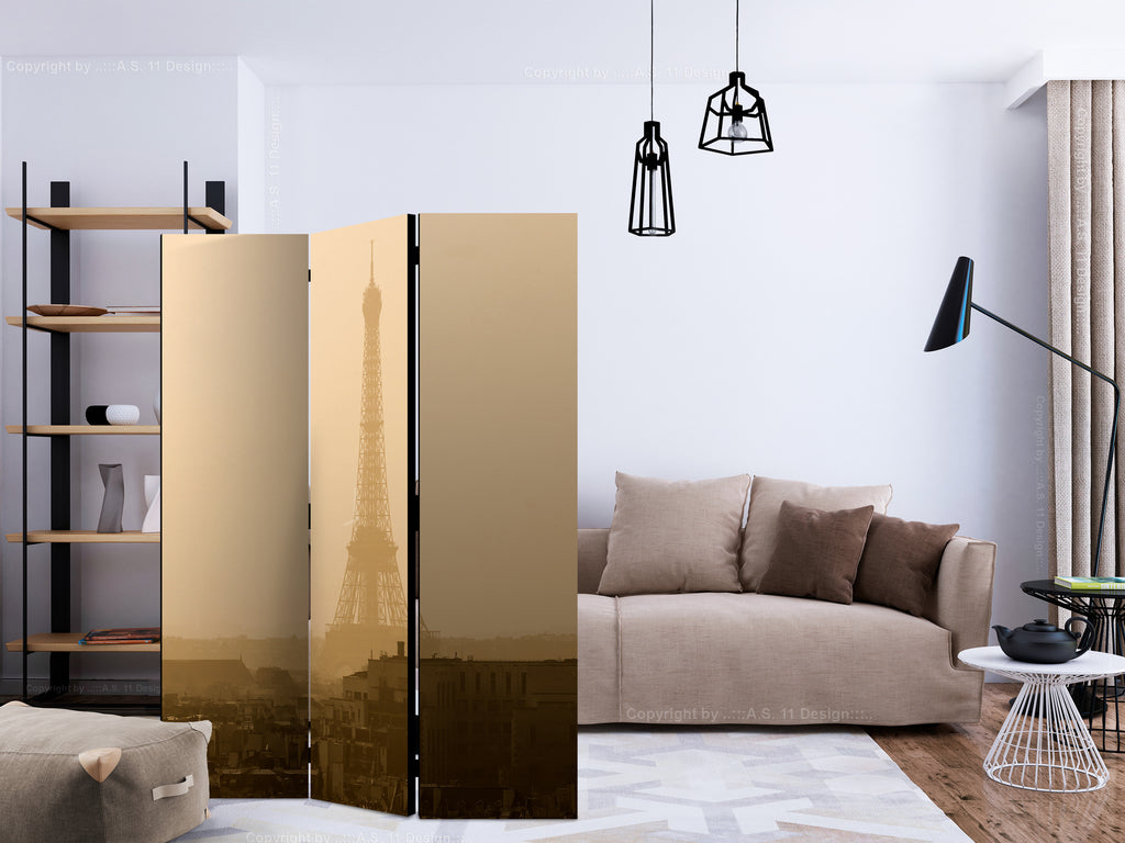 Het decoratieve vouwscherm "Vouwscherm - Paris at Dawn [Room Dividers]" past uitzonderlijk mooi in een modern interieur. Het houten driedelige en tweezijdig bedrukte vouwscherm geeft niet alleen een mooie opdeling van een ruimte maar geeft ook een fantastische flair aan uw interieur. De perfectie uitvoering en het originele motief in full HD uitvoering zorgen ervoor dat de kamervouwschermen iedere ruimte een originele charme verschaffen. Een prachtig kamervouwscherm is een zeer originele versiering en kan bijvoorbeeld prima worden toegepast in woningen of dienstruimten. (kapsalon, dokterskliniek, administratiekantoor etc)