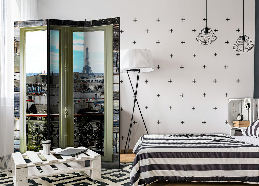 Het decoratieve vouwscherm "Vouwscherm - Parisian View [Room Dividers]" past uitzonderlijk mooi in een modern interieur. Het houten driedelige en tweezijdig bedrukte vouwscherm geeft niet alleen een mooie opdeling van een ruimte maar geeft ook een fantastische flair aan uw interieur. De perfectie uitvoering en het originele motief in full HD uitvoering zorgen ervoor dat de kamervouwschermen iedere ruimte een originele charme verschaffen. Een prachtig kamervouwscherm is een zeer originele versiering en kan bijvoorbeeld prima worden toegepast in woningen of dienstruimten. (kapsalon, dokterskliniek, administratiekantoor etc)