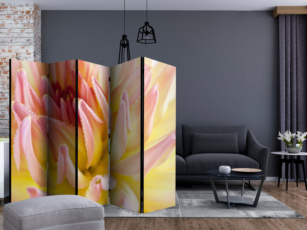 Het decoratieve vouwscherm "Vouwscherm - Pastel colored dahlia flower with dew drops II [Room Dividers]" past uitzonderlijk mooi in een modern interieur. Het houten tweezijdig bedrukte vouwscherm geeft niet alleen een mooie opdeling van een ruimte maar geeft ook een fantastische flair aan uw interieur. De perfectie uitvoering en het originele motief in full HD uitvoering zorgen ervoor dat de kamervouwschermen iedere ruimte een originele charme verschaffen. Een prachtig kamervouwscherm is een zeer originele versiering en kan bijvoorbeeld prima worden toegepast in woningen of dienstruimten. (kapsalon, dokterskliniek, administratiekantoor etc)