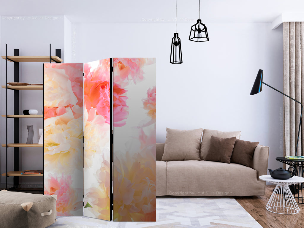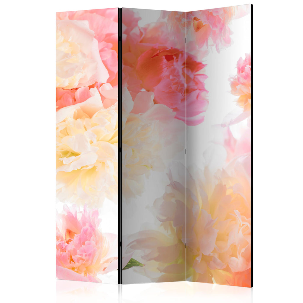 Het decoratieve vouwscherm "Vouwscherm - Pastel peonies [Room Dividers]" past uitzonderlijk mooi in een modern interieur. Het houten driedelige en tweezijdig bedrukte vouwscherm geeft niet alleen een mooie opdeling van een ruimte maar geeft ook een fantastische flair aan uw interieur. De perfectie uitvoering en het originele motief in full HD uitvoering zorgen ervoor dat de kamervouwschermen iedere ruimte een originele charme verschaffen. Een prachtig kamervouwscherm is een zeer originele versiering en kan bijvoorbeeld prima worden toegepast in woningen of dienstruimten. (kapsalon, dokterskliniek, administratiekantoor etc)