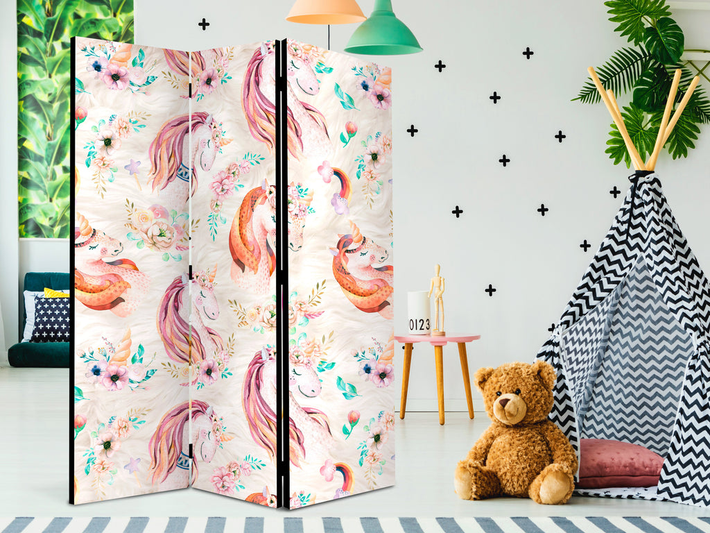 Het decoratieve vouwscherm "Vouwscherm - Pastel Unicorns [Room Dividers]" past uitzonderlijk mooi in een modern interieur. Het houten driedelige en tweezijdig bedrukte vouwscherm geeft niet alleen een mooie opdeling van een ruimte maar geeft ook een fantastische flair aan uw interieur. De perfectie uitvoering en het originele motief in full HD uitvoering zorgen ervoor dat de kamervouwschermen iedere ruimte een originele charme verschaffen. Een prachtig kamervouwscherm is een zeer originele versiering en kan bijvoorbeeld prima worden toegepast in woningen of dienstruimten. (kapsalon, dokterskliniek, administratiekantoor etc)