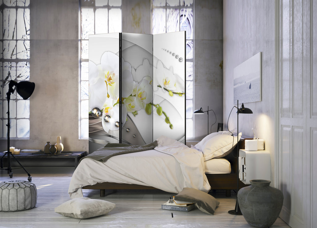 Het decoratieve vouwscherm "Vouwscherm - Pearl Dance of Orchids [Room Dividers]" past uitzonderlijk mooi in een modern interieur. Het houten driedelige en tweezijdig bedrukte vouwscherm geeft niet alleen een mooie opdeling van een ruimte maar geeft ook een fantastische flair aan uw interieur. De perfectie uitvoering en het originele motief in full HD uitvoering zorgen ervoor dat de kamervouwschermen iedere ruimte een originele charme verschaffen. Een prachtig kamervouwscherm is een zeer originele versiering en kan bijvoorbeeld prima worden toegepast in woningen of dienstruimten. (kapsalon, dokterskliniek, administratiekantoor etc)