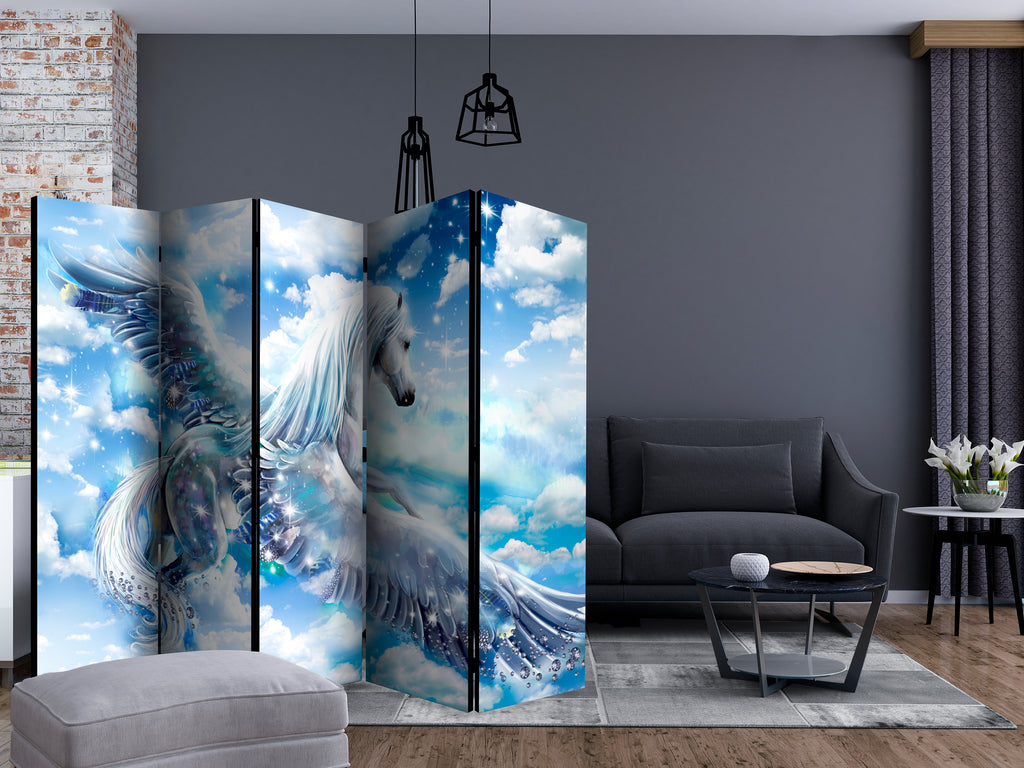 Het decoratieve vouwscherm "Vouwscherm - Pegasus (Blue) II [Room Dividers]" past uitzonderlijk mooi in een modern interieur. Het houten tweezijdig bedrukte vouwscherm geeft niet alleen een mooie opdeling van een ruimte maar geeft ook een fantastische flair aan uw interieur. De perfectie uitvoering en het originele motief in full HD uitvoering zorgen ervoor dat de kamervouwschermen iedere ruimte een originele charme verschaffen. Een prachtig kamervouwscherm is een zeer originele versiering en kan bijvoorbeeld prima worden toegepast in woningen of dienstruimten. (kapsalon, dokterskliniek, administratiekantoor etc)