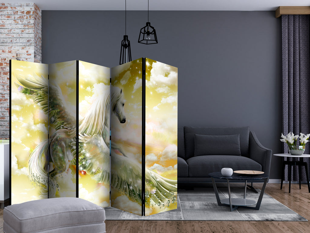 Het decoratieve vouwscherm "Vouwscherm - Pegasus (Yellow) II [Room Dividers]" past uitzonderlijk mooi in een modern interieur. Het houten tweezijdig bedrukte vouwscherm geeft niet alleen een mooie opdeling van een ruimte maar geeft ook een fantastische flair aan uw interieur. De perfectie uitvoering en het originele motief in full HD uitvoering zorgen ervoor dat de kamervouwschermen iedere ruimte een originele charme verschaffen. Een prachtig kamervouwscherm is een zeer originele versiering en kan bijvoorbeeld prima worden toegepast in woningen of dienstruimten. (kapsalon, dokterskliniek, administratiekantoor etc)