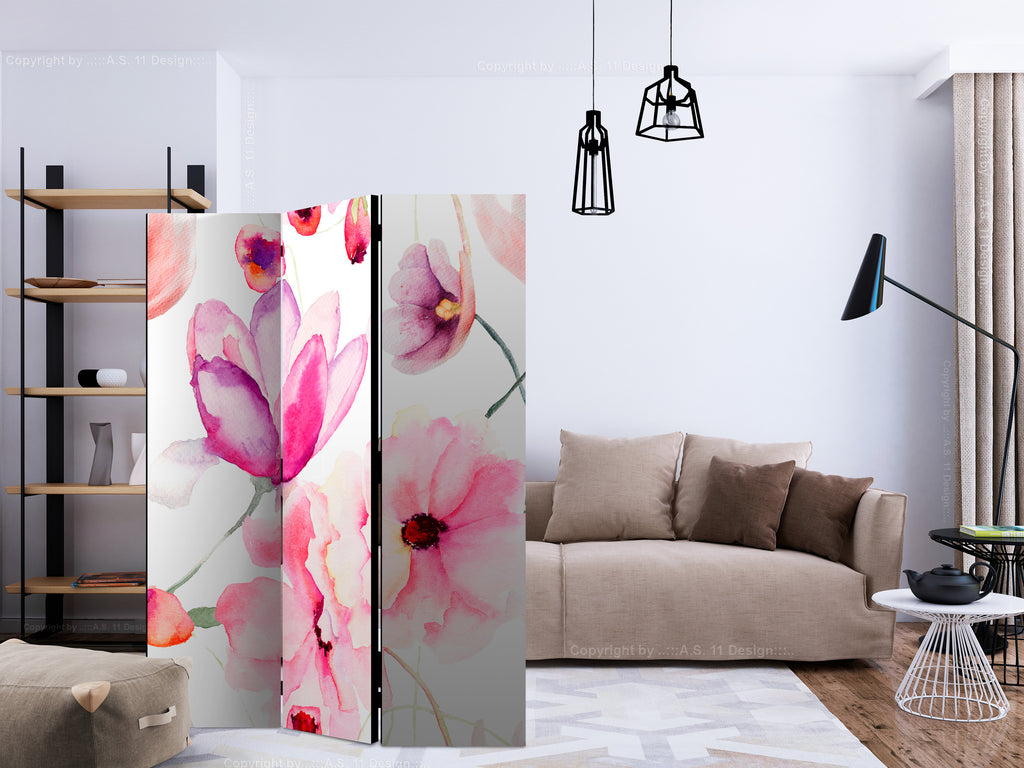 Het decoratieve vouwscherm "Vouwscherm - Pink Flowers [Room Dividers]" past uitzonderlijk mooi in een modern interieur. Het houten driedelige en tweezijdig bedrukte vouwscherm geeft niet alleen een mooie opdeling van een ruimte maar geeft ook een fantastische flair aan uw interieur. De perfectie uitvoering en het originele motief in full HD uitvoering zorgen ervoor dat de kamervouwschermen iedere ruimte een originele charme verschaffen. Een prachtig kamervouwscherm is een zeer originele versiering en kan bijvoorbeeld prima worden toegepast in woningen of dienstruimten. (kapsalon, dokterskliniek, administratiekantoor etc)