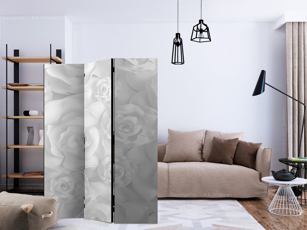 Het decoratieve vouwscherm "Vouwscherm - Plaster Flowers [Room Dividers]" past uitzonderlijk mooi in een modern interieur. Het houten driedelige en tweezijdig bedrukte vouwscherm geeft niet alleen een mooie opdeling van een ruimte maar geeft ook een fantastische flair aan uw interieur. De perfectie uitvoering en het originele motief in full HD uitvoering zorgen ervoor dat de kamervouwschermen iedere ruimte een originele charme verschaffen. Een prachtig kamervouwscherm is een zeer originele versiering en kan bijvoorbeeld prima worden toegepast in woningen of dienstruimten. (kapsalon, dokterskliniek, administratiekantoor etc)