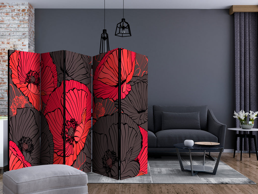 Het decoratieve vouwscherm "Vouwscherm - Pleated poppies II [Room Dividers]" past uitzonderlijk mooi in een modern interieur. Het houten tweezijdig bedrukte vouwscherm geeft niet alleen een mooie opdeling van een ruimte maar geeft ook een fantastische flair aan uw interieur. De perfectie uitvoering en het originele motief in full HD uitvoering zorgen ervoor dat de kamervouwschermen iedere ruimte een originele charme verschaffen. Een prachtig kamervouwscherm is een zeer originele versiering en kan bijvoorbeeld prima worden toegepast in woningen of dienstruimten. (kapsalon, dokterskliniek, administratiekantoor etc)