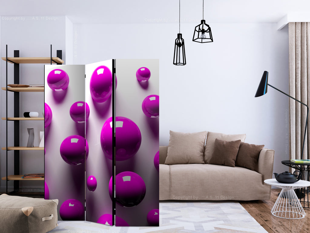 Het decoratieve vouwscherm "Vouwscherm - Purple Balls [Room Dividers]" past uitzonderlijk mooi in een modern interieur. Het houten driedelige en tweezijdig bedrukte vouwscherm geeft niet alleen een mooie opdeling van een ruimte maar geeft ook een fantastische flair aan uw interieur. De perfectie uitvoering en het originele motief in full HD uitvoering zorgen ervoor dat de kamervouwschermen iedere ruimte een originele charme verschaffen. Een prachtig kamervouwscherm is een zeer originele versiering en kan bijvoorbeeld prima worden toegepast in woningen of dienstruimten. (kapsalon, dokterskliniek, administratiekantoor etc)