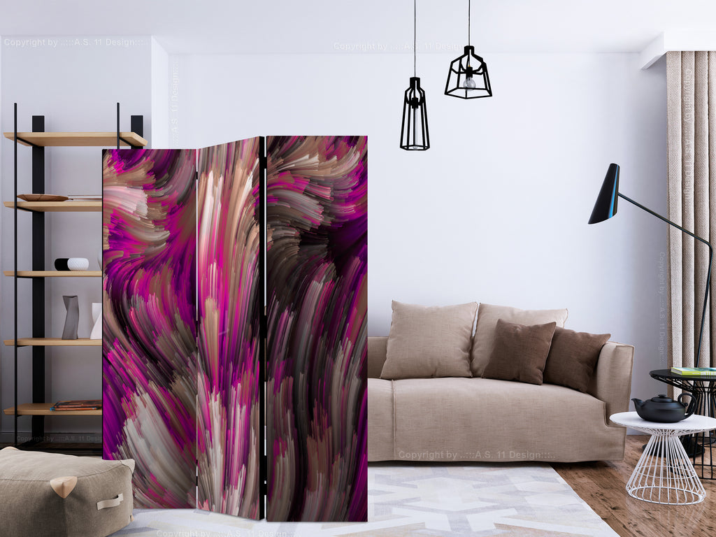 Het decoratieve vouwscherm "Vouwscherm - Purple Energy [Room Dividers]" past uitzonderlijk mooi in een modern interieur. Het houten driedelige en tweezijdig bedrukte vouwscherm geeft niet alleen een mooie opdeling van een ruimte maar geeft ook een fantastische flair aan uw interieur. De perfectie uitvoering en het originele motief in full HD uitvoering zorgen ervoor dat de kamervouwschermen iedere ruimte een originele charme verschaffen. Een prachtig kamervouwscherm is een zeer originele versiering en kan bijvoorbeeld prima worden toegepast in woningen of dienstruimten. (kapsalon, dokterskliniek, administratiekantoor etc)