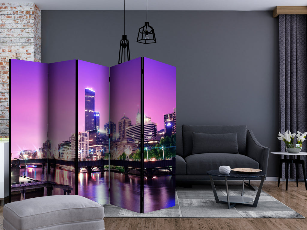 Het decoratieve vouwscherm "Vouwscherm - Purple Melbourne II [Room Dividers]" past uitzonderlijk mooi in een modern interieur. Het houten tweezijdig bedrukte vouwscherm geeft niet alleen een mooie opdeling van een ruimte maar geeft ook een fantastische flair aan uw interieur. De perfectie uitvoering en het originele motief in full HD uitvoering zorgen ervoor dat de kamervouwschermen iedere ruimte een originele charme verschaffen. Een prachtig kamervouwscherm is een zeer originele versiering en kan bijvoorbeeld prima worden toegepast in woningen of dienstruimten. (kapsalon, dokterskliniek, administratiekantoor etc)
