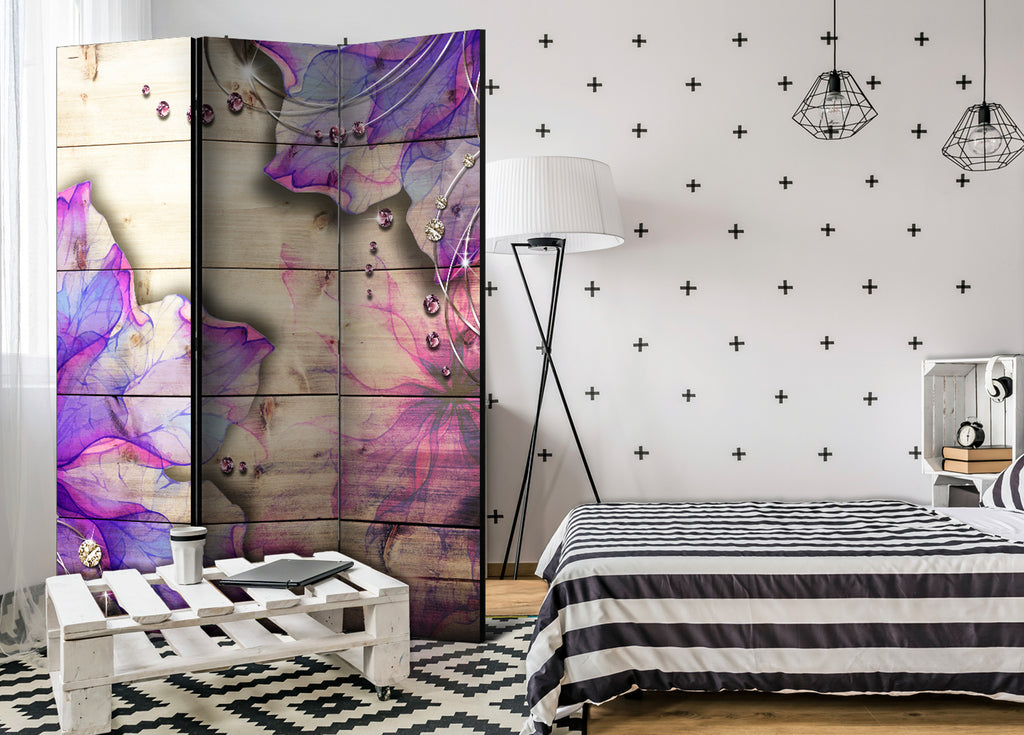 Het decoratieve vouwscherm "Vouwscherm - Purple Memory [Room Dividers]" past uitzonderlijk mooi in een modern interieur. Het houten driedelige en tweezijdig bedrukte vouwscherm geeft niet alleen een mooie opdeling van een ruimte maar geeft ook een fantastische flair aan uw interieur. De perfectie uitvoering en het originele motief in full HD uitvoering zorgen ervoor dat de kamervouwschermen iedere ruimte een originele charme verschaffen. Een prachtig kamervouwscherm is een zeer originele versiering en kan bijvoorbeeld prima worden toegepast in woningen of dienstruimten. (kapsalon, dokterskliniek, administratiekantoor etc)