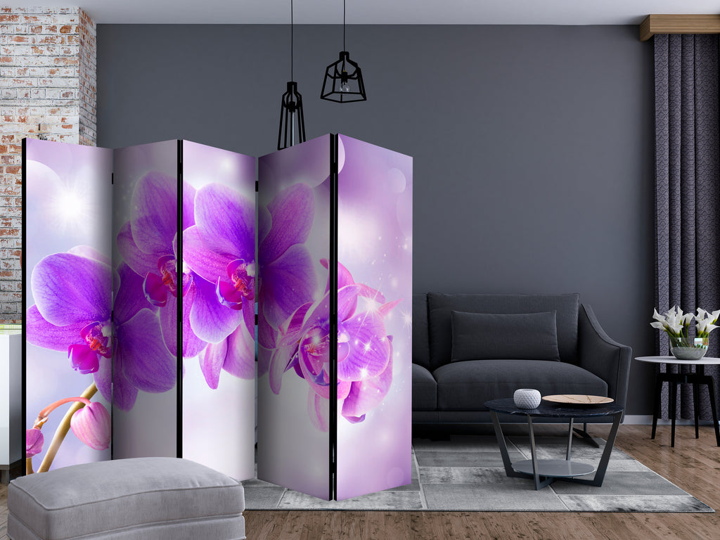 Het decoratieve vouwscherm "Vouwscherm - Purple Orchids II [Room Dividers]" past uitzonderlijk mooi in een modern interieur. Het houten tweezijdig bedrukte vouwscherm geeft niet alleen een mooie opdeling van een ruimte maar geeft ook een fantastische flair aan uw interieur. De perfectie uitvoering en het originele motief in full HD uitvoering zorgen ervoor dat de kamervouwschermen iedere ruimte een originele charme verschaffen. Een prachtig kamervouwscherm is een zeer originele versiering en kan bijvoorbeeld prima worden toegepast in woningen of dienstruimten. (kapsalon, dokterskliniek, administratiekantoor etc)