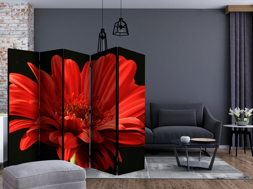 Het decoratieve vouwscherm "Vouwscherm - Red gerbera flower II [Room Dividers]" past uitzonderlijk mooi in een modern interieur. Het houten tweezijdig bedrukte vouwscherm geeft niet alleen een mooie opdeling van een ruimte maar geeft ook een fantastische flair aan uw interieur. De perfectie uitvoering en het originele motief in full HD uitvoering zorgen ervoor dat de kamervouwschermen iedere ruimte een originele charme verschaffen. Een prachtig kamervouwscherm is een zeer originele versiering en kan bijvoorbeeld prima worden toegepast in woningen of dienstruimten. (kapsalon, dokterskliniek, administratiekantoor etc)