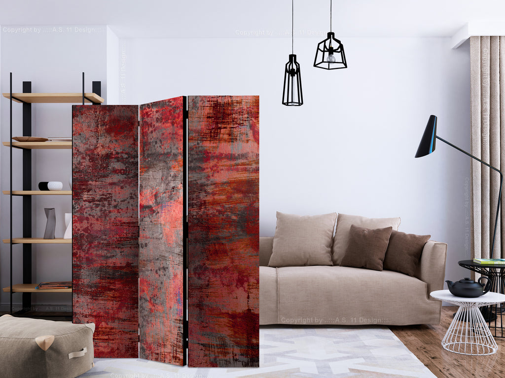 Het decoratieve vouwscherm "Vouwscherm - Red Metal [Room Dividers]" past uitzonderlijk mooi in een modern interieur. Het houten driedelige en tweezijdig bedrukte vouwscherm geeft niet alleen een mooie opdeling van een ruimte maar geeft ook een fantastische flair aan uw interieur. De perfectie uitvoering en het originele motief in full HD uitvoering zorgen ervoor dat de kamervouwschermen iedere ruimte een originele charme verschaffen. Een prachtig kamervouwscherm is een zeer originele versiering en kan bijvoorbeeld prima worden toegepast in woningen of dienstruimten. (kapsalon, dokterskliniek, administratiekantoor etc)