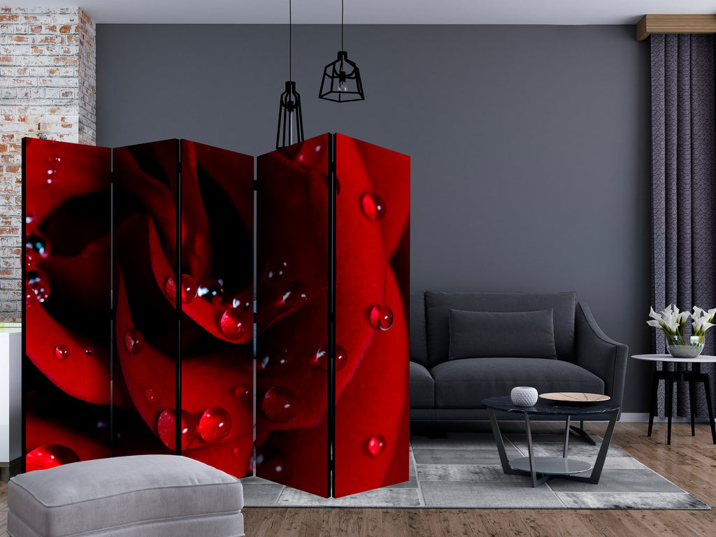 Het decoratieve vouwscherm "Vouwscherm - Red rose with water drops II [Room Dividers]" past uitzonderlijk mooi in een modern interieur. Het houten tweezijdig bedrukte vouwscherm geeft niet alleen een mooie opdeling van een ruimte maar geeft ook een fantastische flair aan uw interieur. De perfectie uitvoering en het originele motief in full HD uitvoering zorgen ervoor dat de kamervouwschermen iedere ruimte een originele charme verschaffen. Een prachtig kamervouwscherm is een zeer originele versiering en kan bijvoorbeeld prima worden toegepast in woningen of dienstruimten. (kapsalon, dokterskliniek, administratiekantoor etc)