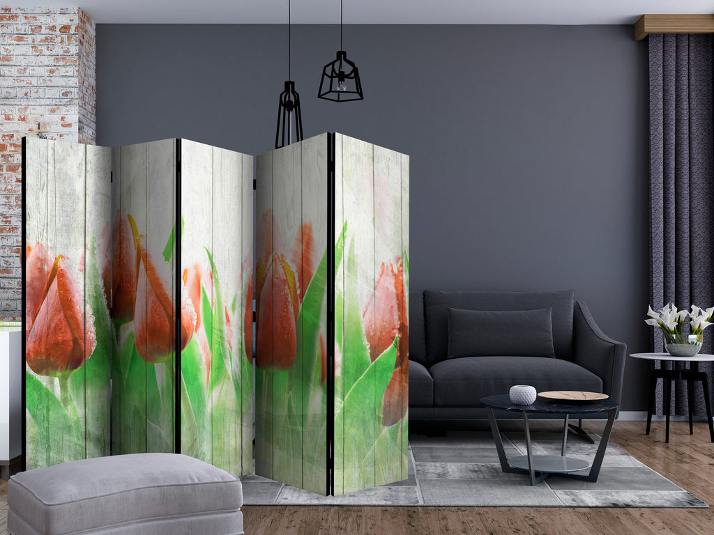 Het decoratieve vouwscherm "Vouwscherm - Red tulips on wood II [Room Dividers]" past uitzonderlijk mooi in een modern interieur. Het houten tweezijdig bedrukte vouwscherm geeft niet alleen een mooie opdeling van een ruimte maar geeft ook een fantastische flair aan uw interieur. De perfectie uitvoering en het originele motief in full HD uitvoering zorgen ervoor dat de kamervouwschermen iedere ruimte een originele charme verschaffen. Een prachtig kamervouwscherm is een zeer originele versiering en kan bijvoorbeeld prima worden toegepast in woningen of dienstruimten. (kapsalon, dokterskliniek, administratiekantoor etc)