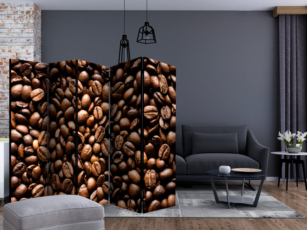 Het decoratieve vouwscherm "Vouwscherm - Roasted coffee beans II [Room Dividers]" past uitzonderlijk mooi in een modern interieur. Het houten tweezijdig bedrukte vouwscherm geeft niet alleen een mooie opdeling van een ruimte maar geeft ook een fantastische flair aan uw interieur. De perfectie uitvoering en het originele motief in full HD uitvoering zorgen ervoor dat de kamervouwschermen iedere ruimte een originele charme verschaffen. Een prachtig kamervouwscherm is een zeer originele versiering en kan bijvoorbeeld prima worden toegepast in woningen of dienstruimten. (kapsalon, dokterskliniek, administratiekantoor etc)