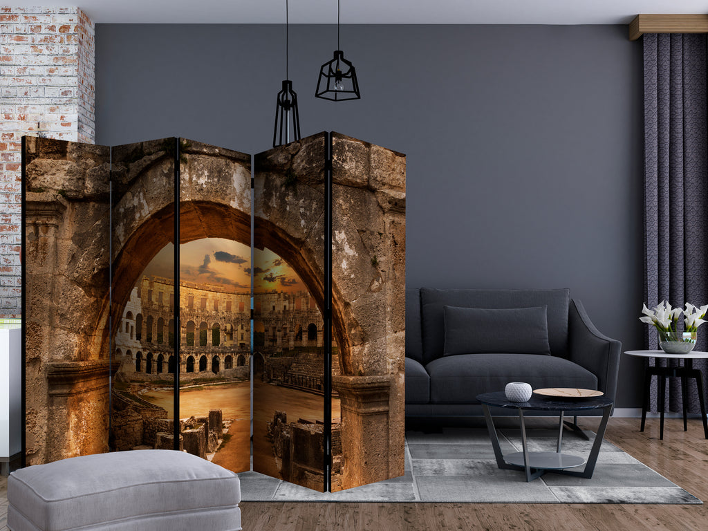 Het decoratieve vouwscherm "Vouwscherm - Roman Amphitheatre in Pula, Croatia II [Room Dividers]" past uitzonderlijk mooi in een modern interieur. Het houten tweezijdig bedrukte vouwscherm geeft niet alleen een mooie opdeling van een ruimte maar geeft ook een fantastische flair aan uw interieur. De perfectie uitvoering en het originele motief in full HD uitvoering zorgen ervoor dat de kamervouwschermen iedere ruimte een originele charme verschaffen. Een prachtig kamervouwscherm is een zeer originele versiering en kan bijvoorbeeld prima worden toegepast in woningen of dienstruimten. (kapsalon, dokterskliniek, administratiekantoor etc)