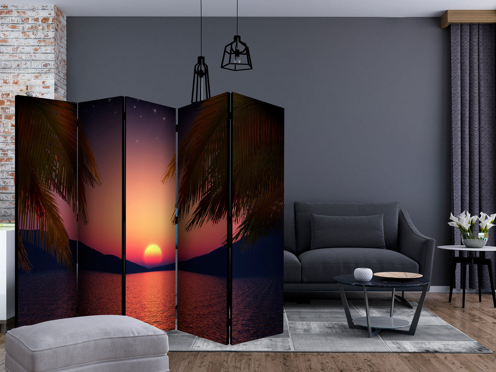 Het decoratieve vouwscherm "Vouwscherm - Romantic evening on the beach II [Room Dividers]" past uitzonderlijk mooi in een modern interieur. Het houten tweezijdig bedrukte vouwscherm geeft niet alleen een mooie opdeling van een ruimte maar geeft ook een fantastische flair aan uw interieur. De perfectie uitvoering en het originele motief in full HD uitvoering zorgen ervoor dat de kamervouwschermen iedere ruimte een originele charme verschaffen. Een prachtig kamervouwscherm is een zeer originele versiering en kan bijvoorbeeld prima worden toegepast in woningen of dienstruimten. (kapsalon, dokterskliniek, administratiekantoor etc)